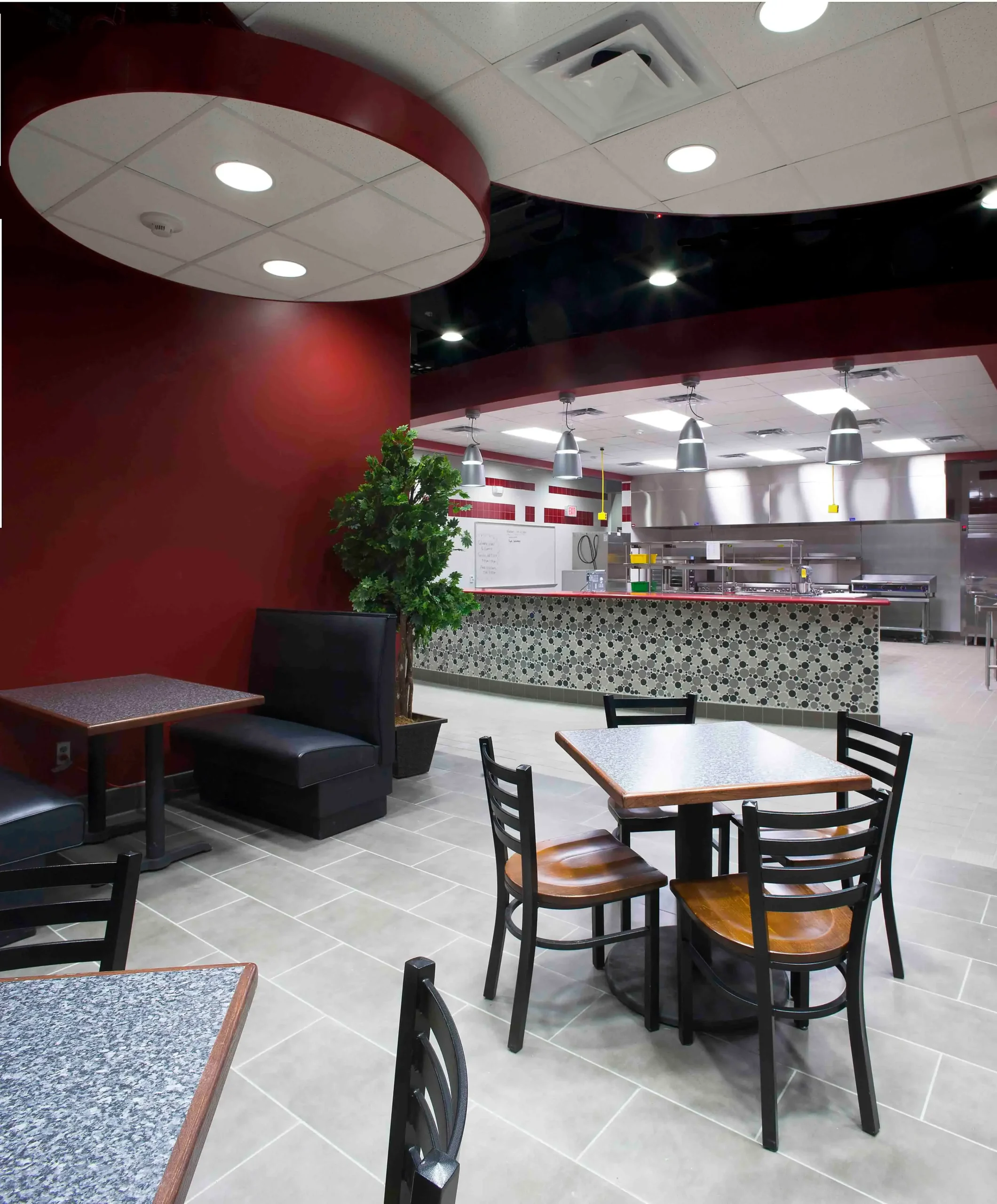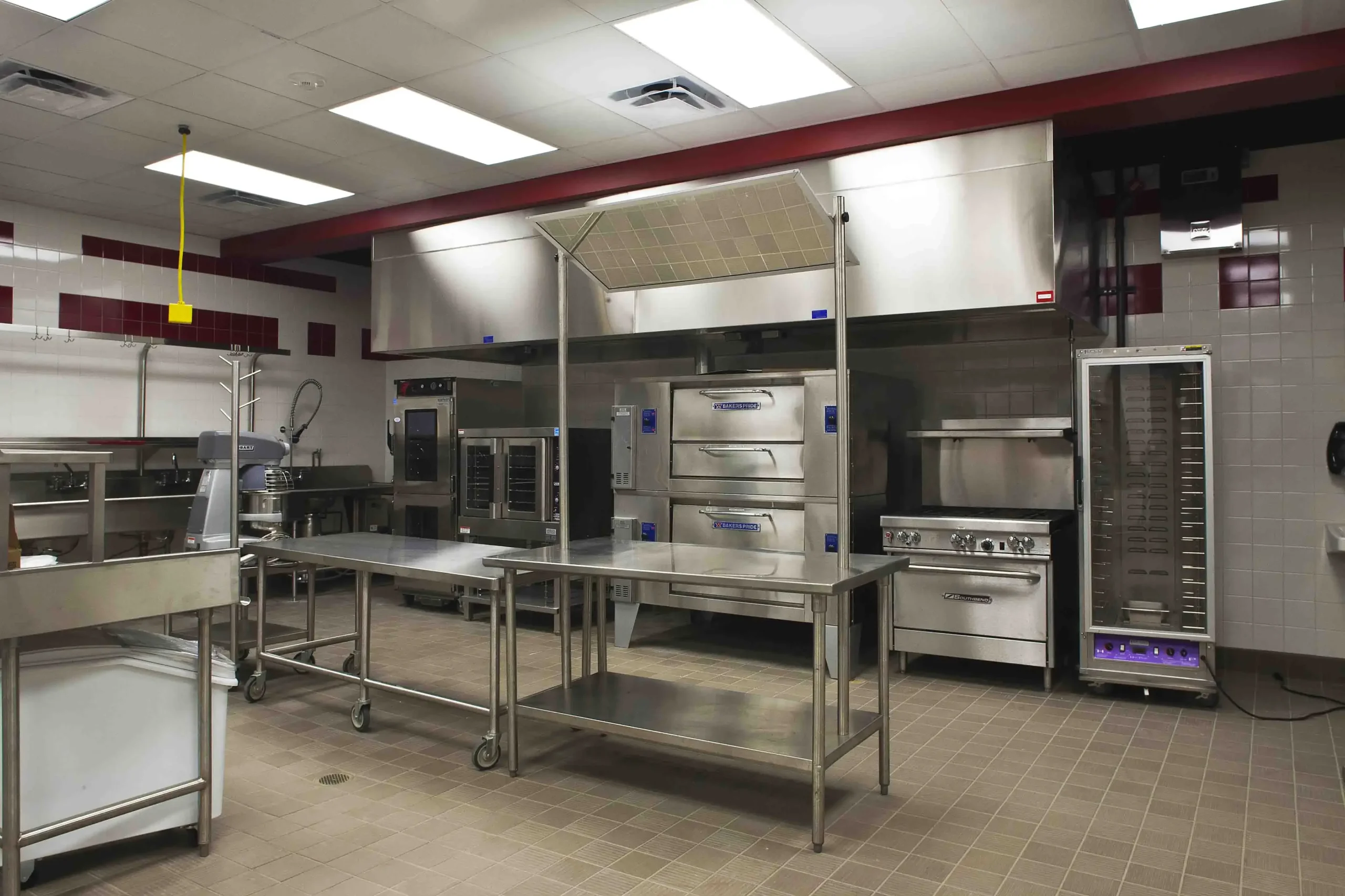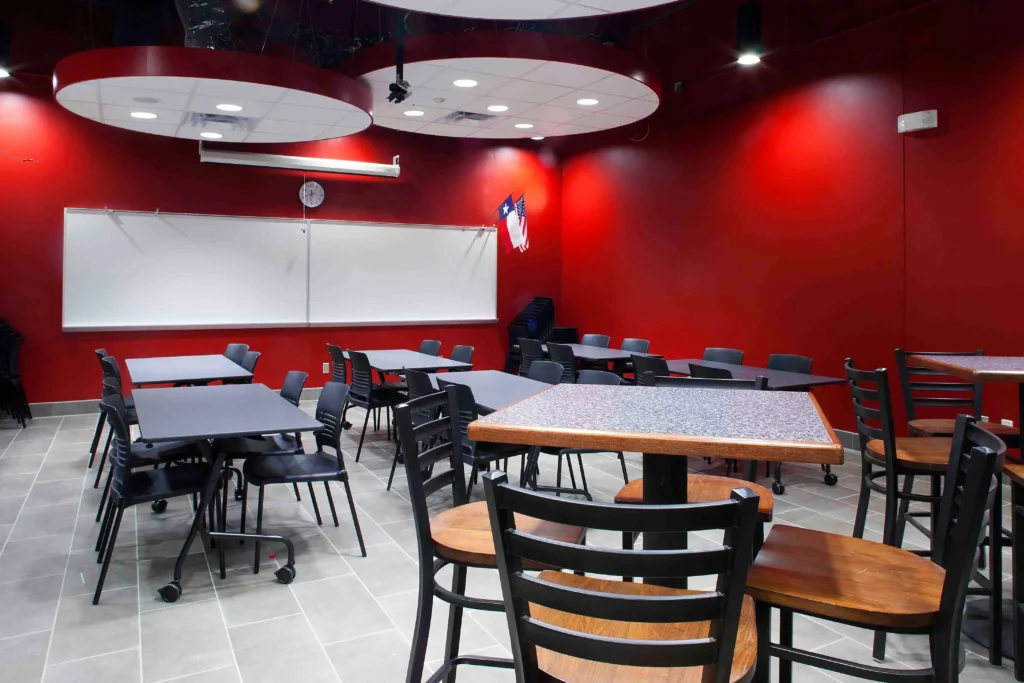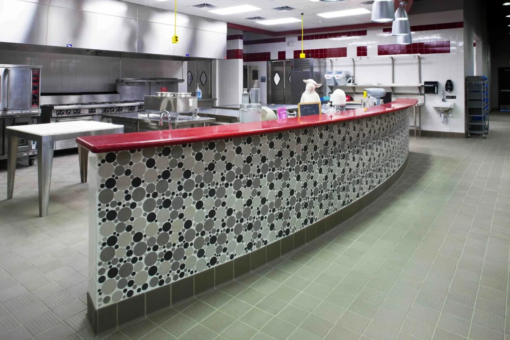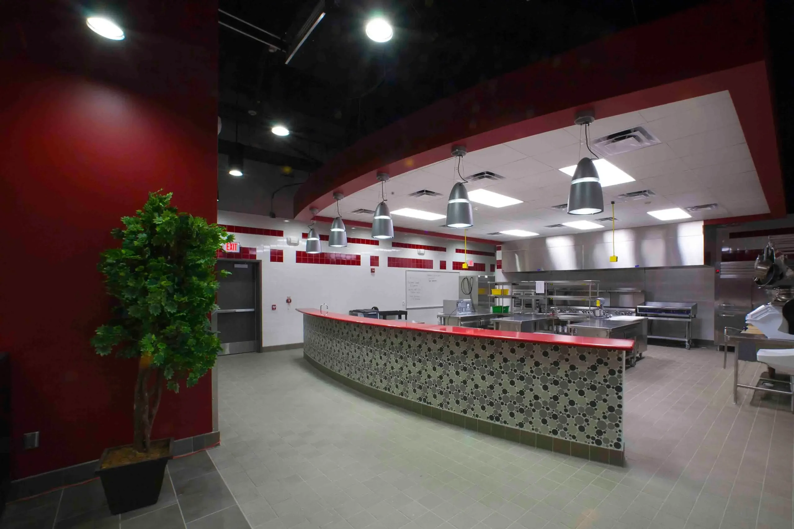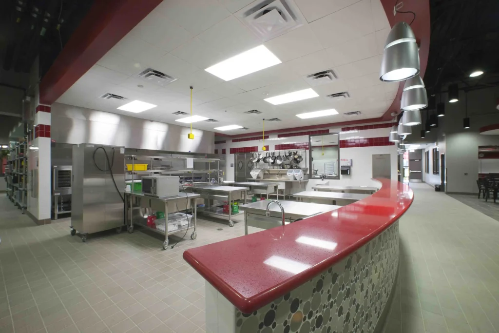 This culinary arts center was equipped with the most recent kitchen equipment on the market to help prepare students for a career in the culinary industry. Allotted only five months to complete this renovation, a strict schedule was established and maintained in order for classes to be held in this space during the spring semester. Some of the finest finishes from floor to ceiling were incorporated into this space including ceramic, porcelain and quarry tile on the floor and walls, quartz countertops, architectural drywall furrdowns, “floating” cloud acoustical ceilings, and pendant type light fixtures.